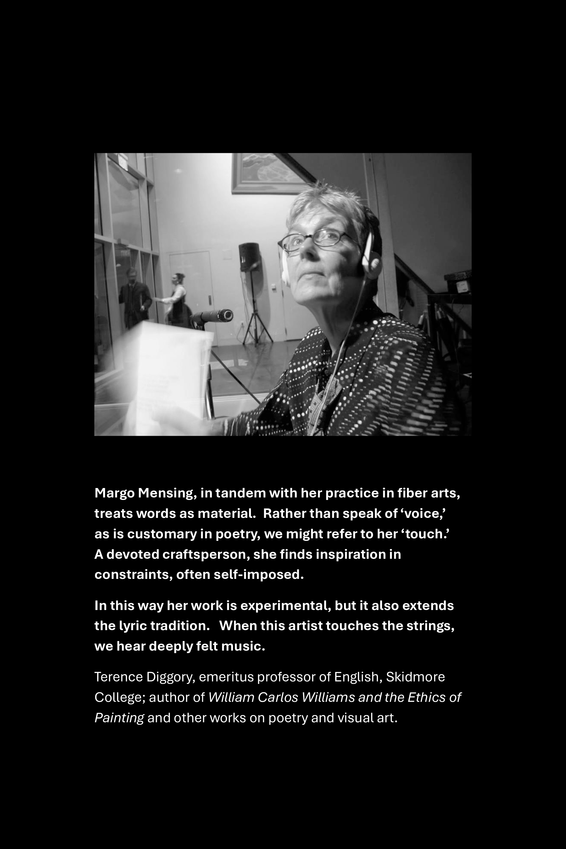 As in her meditation on cleaning the chandelier that takes in prisms of light, splinters of color, and all the fumes of ammonia, Margo Mensing’s poems look to the full experience of everyday life. Whether coming from the studio or the kitchen, Mensing’s voice ranges from the conversational and casual observational to more formal testimony. Throughout, she establishes a rhythm of evocative imagery, keen observation, a sense of distillation and clarity, a crisp close. We find in these pages a woman at the oars on the lake on a windy Saturday wearing a mirrored cap that offers sightlines to what is behind, what is ahead; these poems, too, take in the full view.